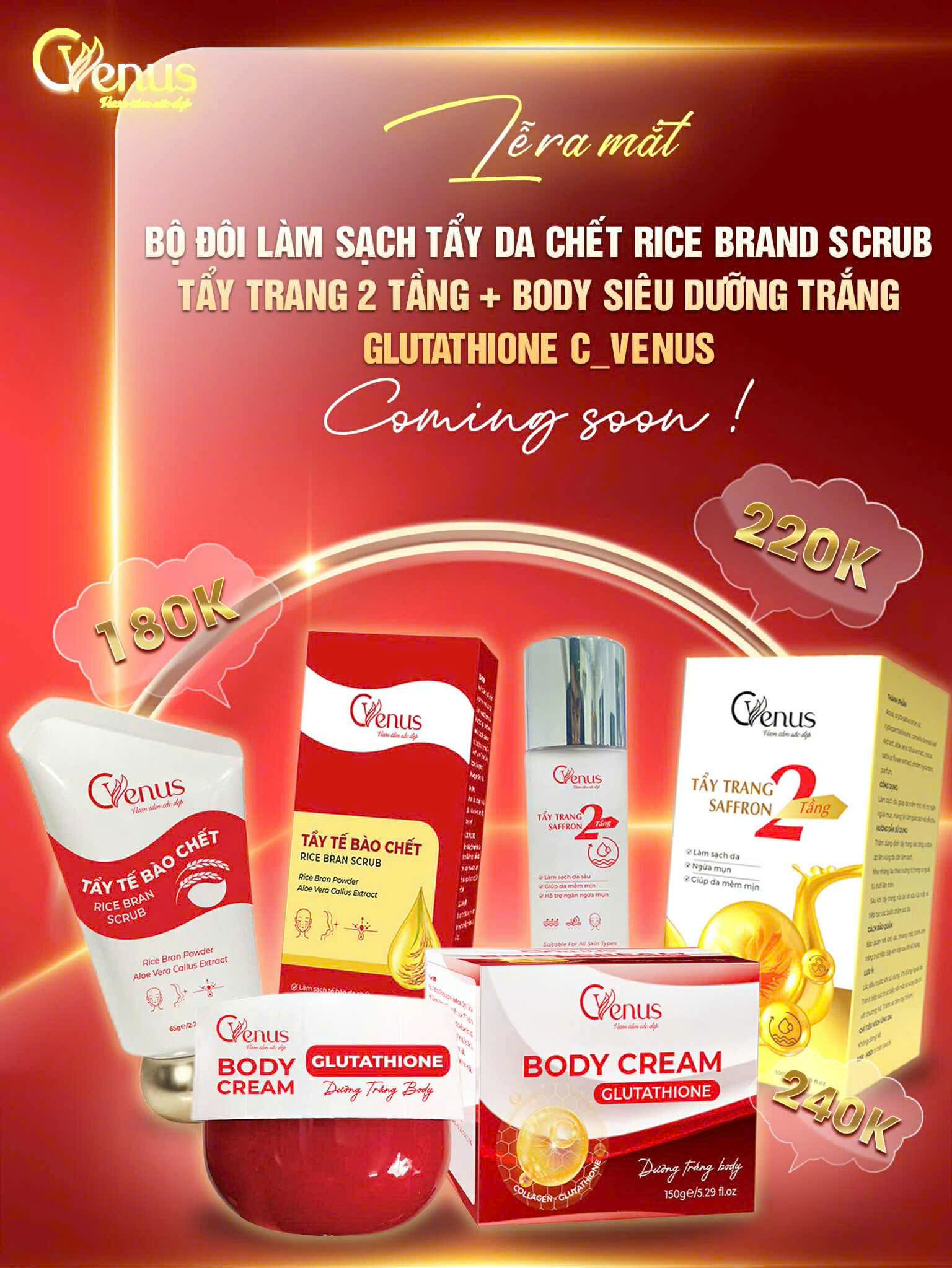 Khám phá bộ sản phẩm mới của C-Venus: Tẩy Tế Bào Chết Cám Gạo, Tẩy Trang Saffron 2 Tầng và Body Cream Glutathione. Giúp làm sạch, dưỡng trắng và chăm sóc da toàn diện.